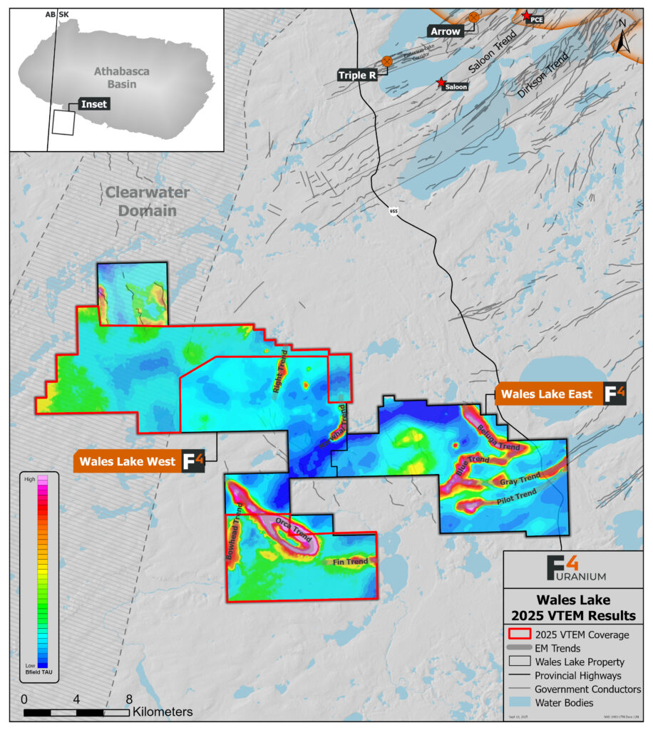 Kelowna, British Columbia–(Newsfile Corp. – September 22, 2025) – F4 Uranium Corp. (TSXV:FFU) (OTCQB: FFUCF) (the “Company” or “F4“) is pleased to announce it has identified three new conductive trends on the Wales Lake West Property (see Figure 1) from the 1,031 km of airborne VTEMTMPlus surveying completed at its Wales Lake Project, and deeper interpretation of the data is in progress. The project is in the western Athabasca Basin region of northern Saskatchewan and located approximately 20 km southwest of Paladin’s Triple R uranium deposit, and 28 km southwest of Nexgen Energy’s Arrow deposit. It lies southwest of multiple conductive corridors, including the Dirkson as well as the Saloon Trend, host to both Nexgen Energy’s PCE uranium occurrence and Paladin Energy’s recently discovered Saloon East (see Figure 1).
